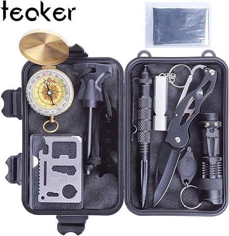 Exqline outdoor survival kits 12 in 1 survival gear kits set multi purpose emergency first aid tool with compass survival bracelet pliers fire starter flashlight for hiking camping climbing cars.