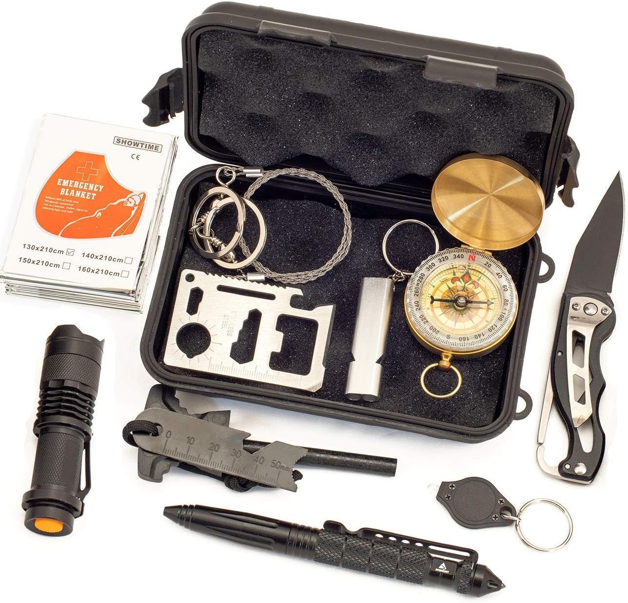 Alritz emergency survival kit 12 in 1 outdoor survival gear lifesaving tools contains compass fire starter flashlights for camping hiking wilderness adventures and disaster preparedness.